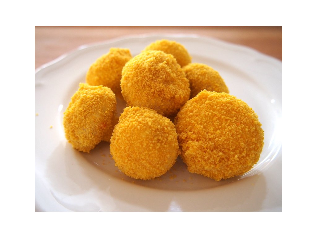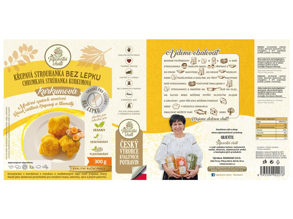 Složení: strouhanka ( rýžová mouka, dextróza (kukuřice), sůl, emulgátor: E 471, paprikový prášek, prášek z kurkumy)