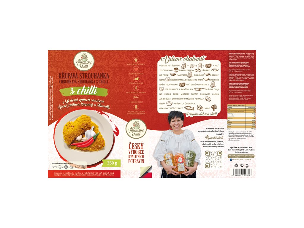 Moderní univerzální obalovací směs vyrobená podle vlastní receptury k přípravě masa, ryb, zeleniny, sýrů.Vhodná ke smažení na oleji, na sucho i na grilu.
