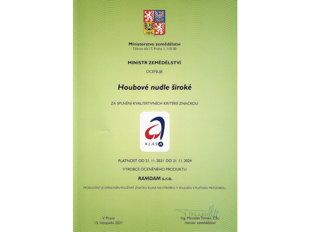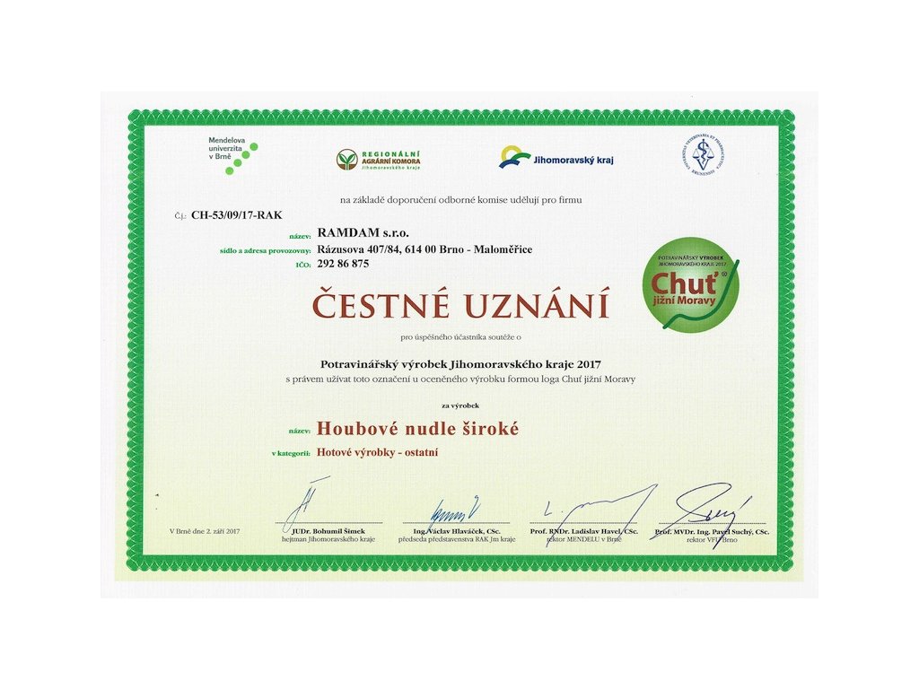 Tyto těstoviny získaly ocenění Chuť jižní Moravy 2017 a dále mají označení České cechovní normy, garance kvalitní potraviny pod záštitou Potravinářské komory České republiky.