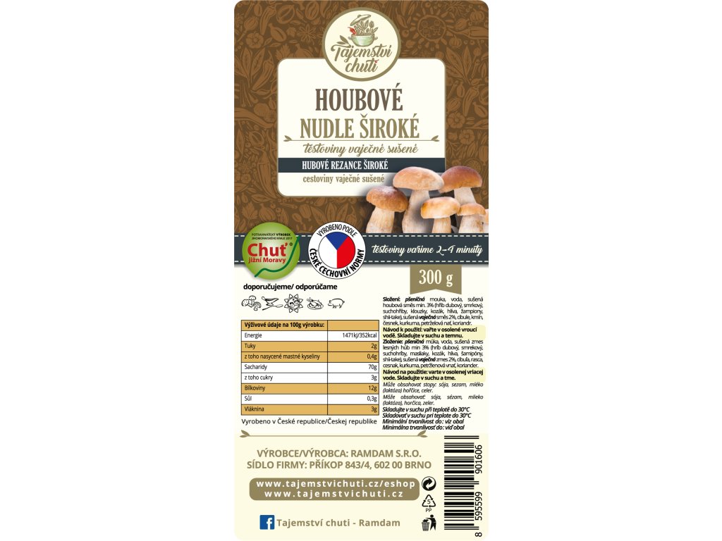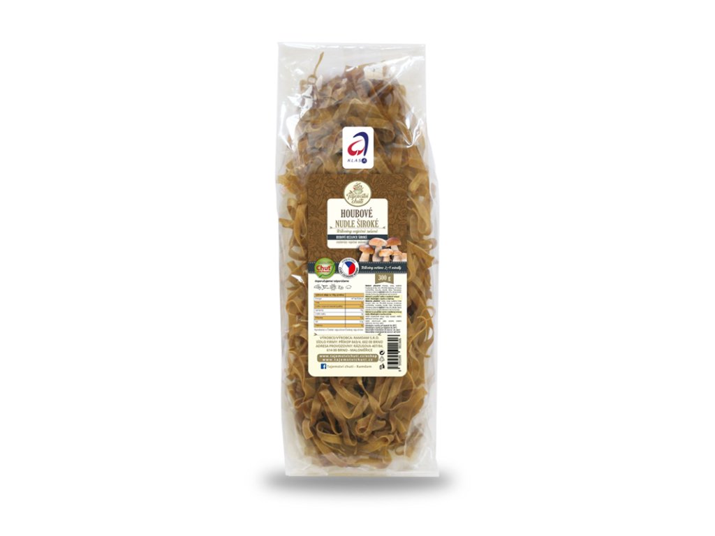 Složení: pšeničná mouka, voda, sušená houbová směs 3% (hřib dubový, smrkový, suchohřiby, klouzky, kozák, hlíva, žampiony, shii-take), sušená vaječná směs 2%, cibule, kmín, česnek, kurkuma, petrželová nať, koriandr.