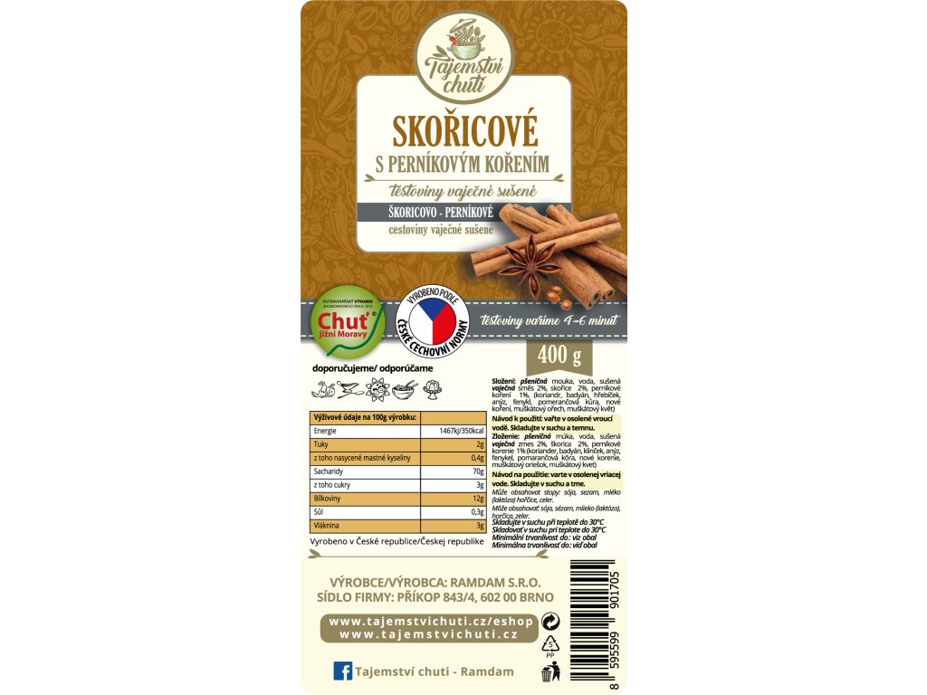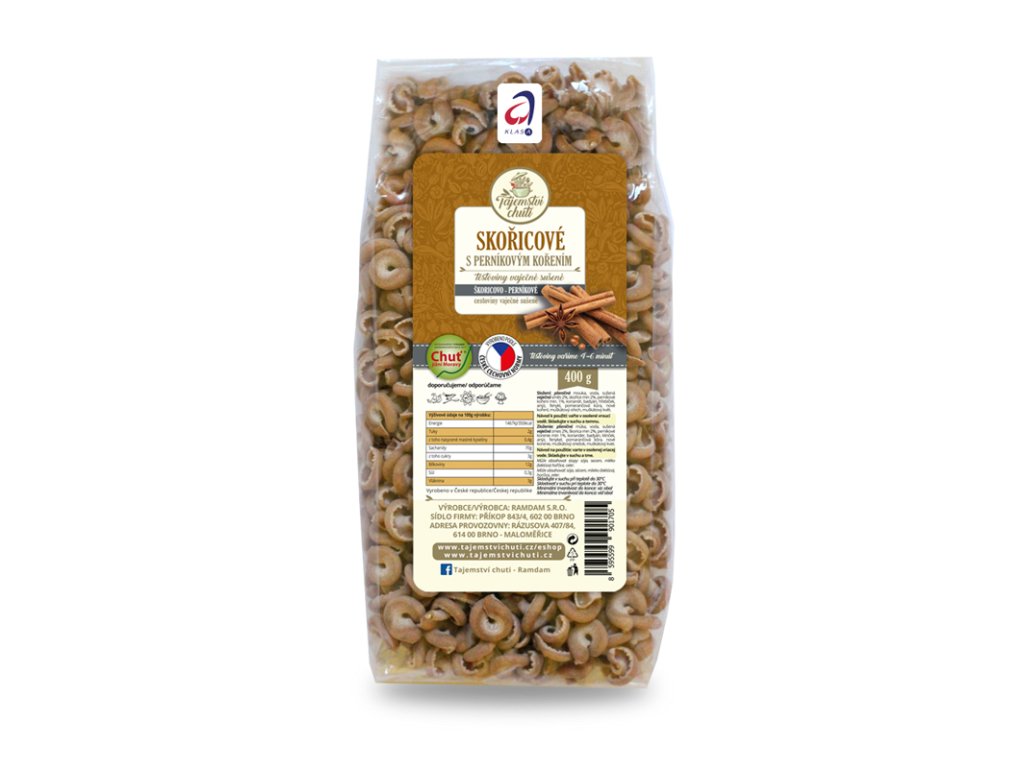 Složení: pšeničná mouka, voda, sušená vaječná směs 2%, skořice 2%, perníkové koření 1%, koriandr, badyán, hřebíček, anýz, fenykl, pomerančová kůra, nové koření, muškátový ořech, muškátový květ.