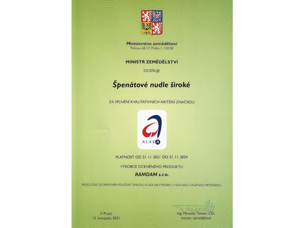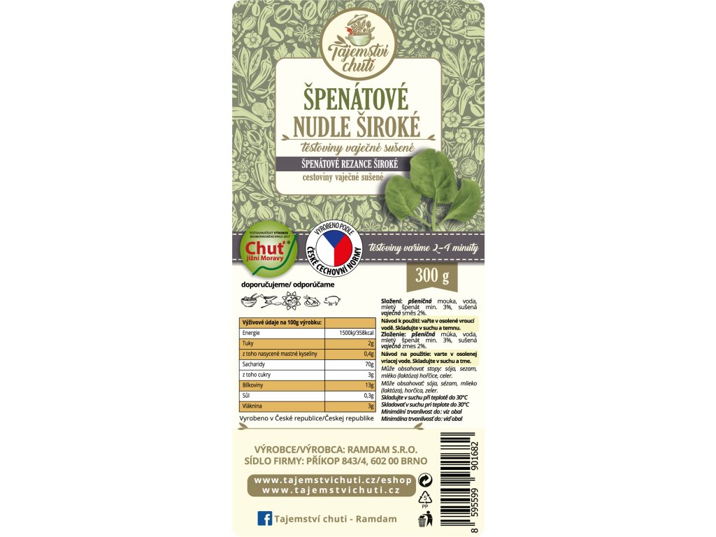 Složení: pšeničná mouka, voda, mletý špenát 3%, sušená vaječná směs 2%