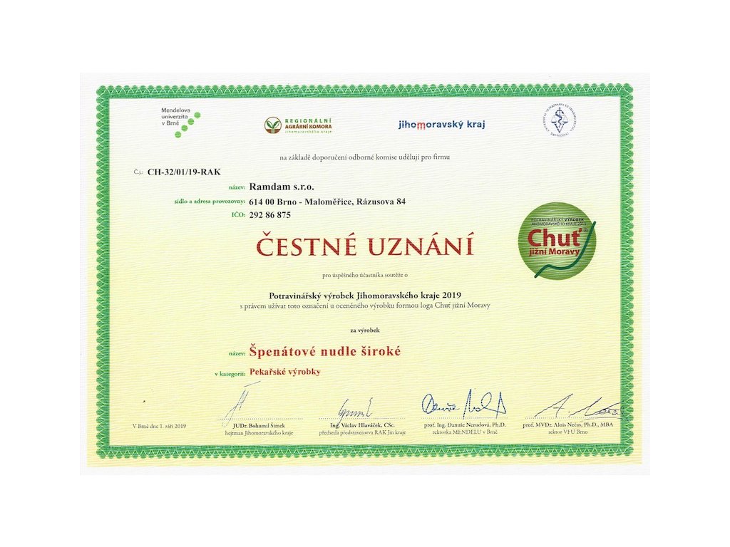 Tyto těstoviny získaly ocenění Zlatá Salima 2018 , Chuť jižní Moravy 2017 a dále mají označení České cechovní normy, garance kvalitní potraviny pod záštitou Potravinářské komory České republiky.